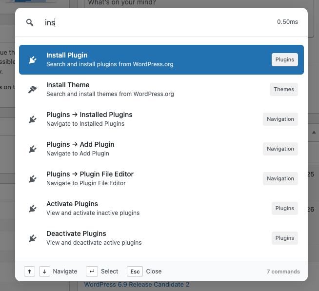 When you open the palette and type the name of a plugin, Commandify searches both installed plugins and the WordPress.org plugin directory.