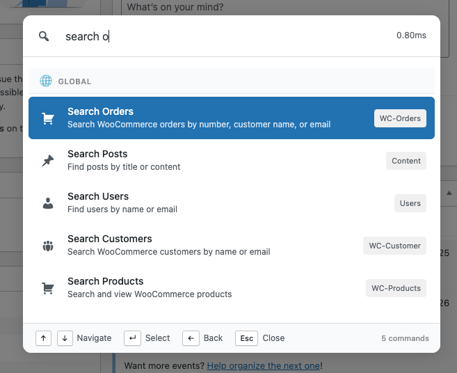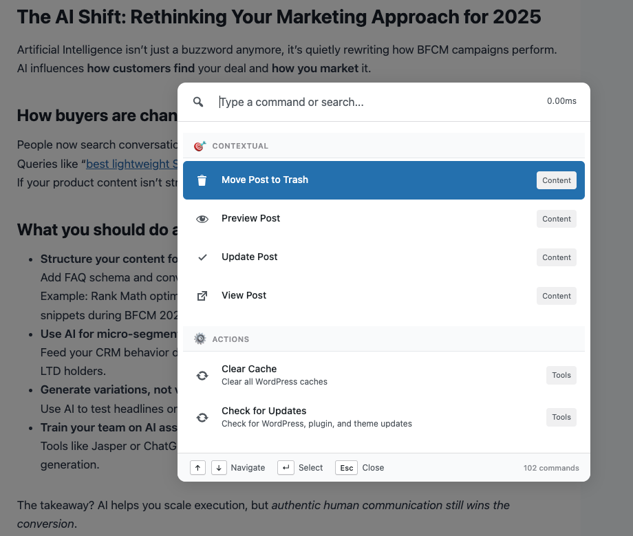 It adds contextual actions, dynamic commands, WooCommerce controls, settings management, and workflow intelligence. These features make Commandify not just a navigation tool, but a command center for your entire WordPress admin.