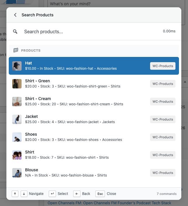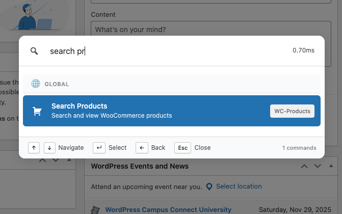 Instead of navigating through multiple WooCommerce screens, you can search, update, and act on store data directly from the command palette.